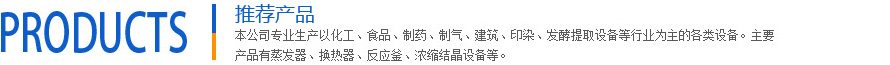 本公司專業(yè)生產以化工、食品、制藥、制氣、建筑、印染等行業(yè)為主的各類設備。主要產品有發(fā)酵提取設備,濃縮結晶設備,蒸發(fā)器、換熱器、反應釜、分離容器、儲罐、熱交換器、冷凝器,全自動供水設備、不銹鋼裝配式水箱、凝結水回收等各類壓力容器及非標產品。其中離心式刮板薄膜蒸發(fā)器獲江蘇省優(yōu)質產品。